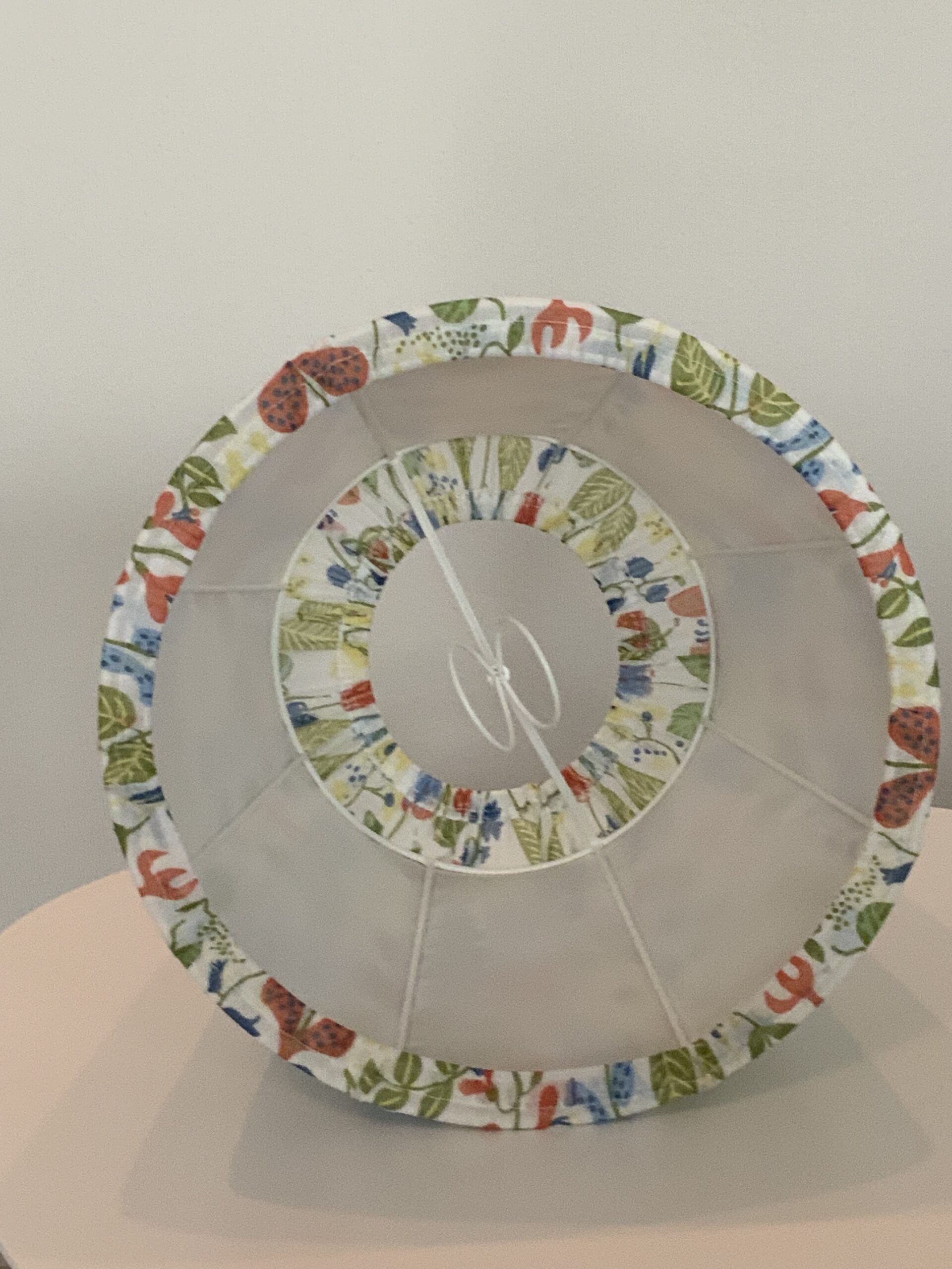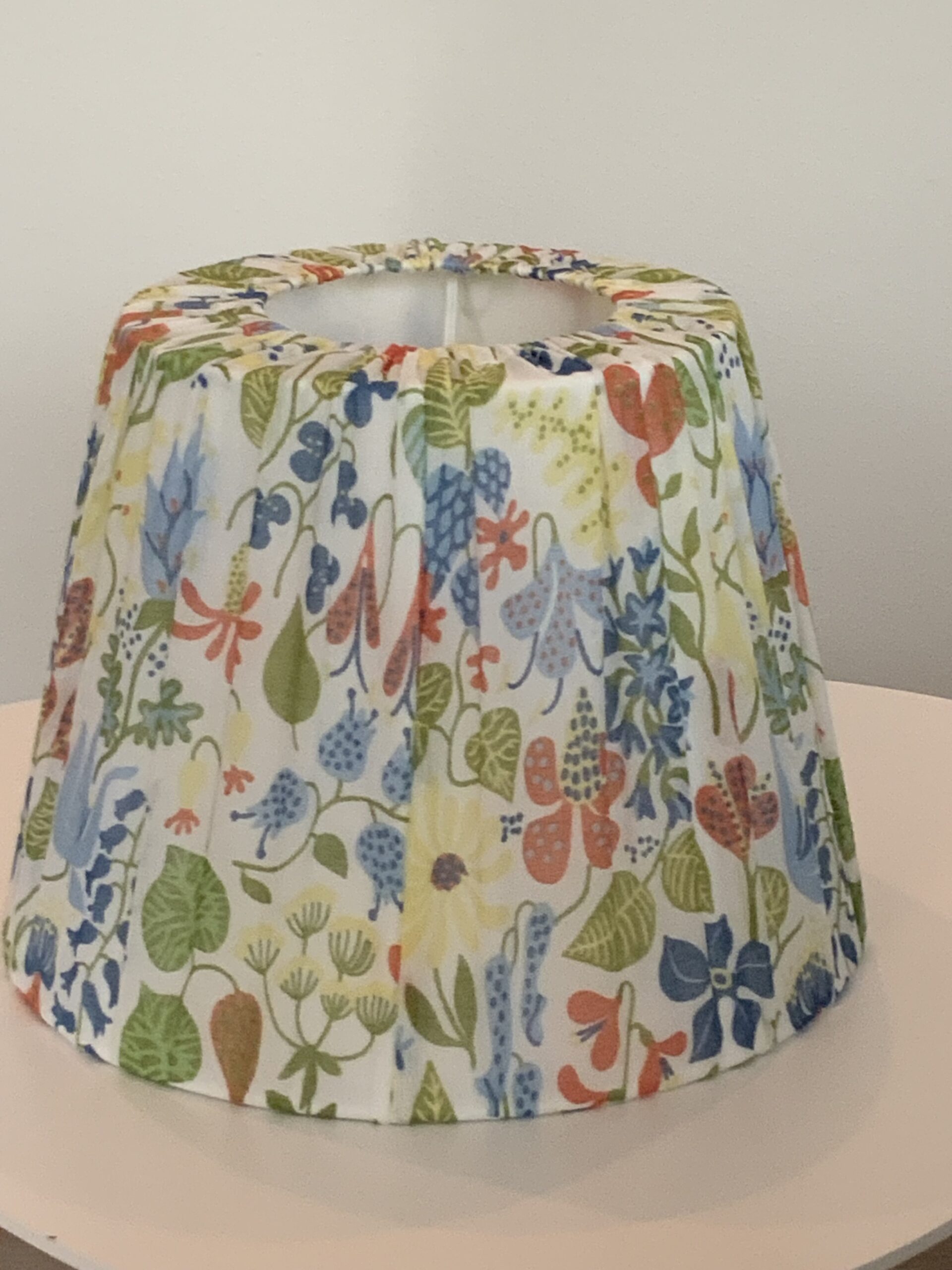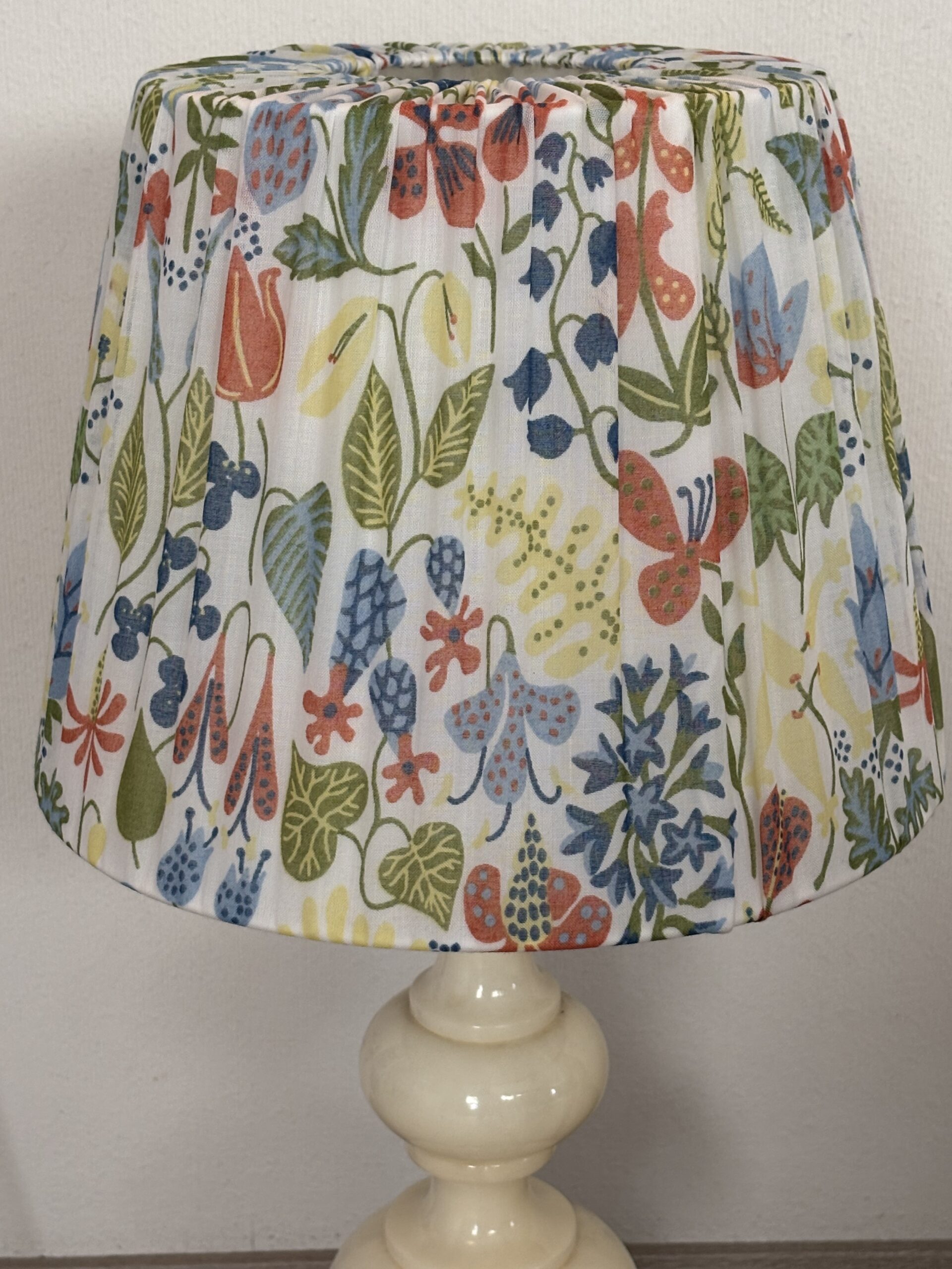 Lampskärmen är fodrad med foder som är avsett för lampskärmar och klädd med Stig Lindberg designade Herbarium tyg detta fall mycket tunt som är lätt rynkad. Skärmen har dragsko uppe och nere med gummiband vilket också gör att man kan senare även byta efter tycke och smak.